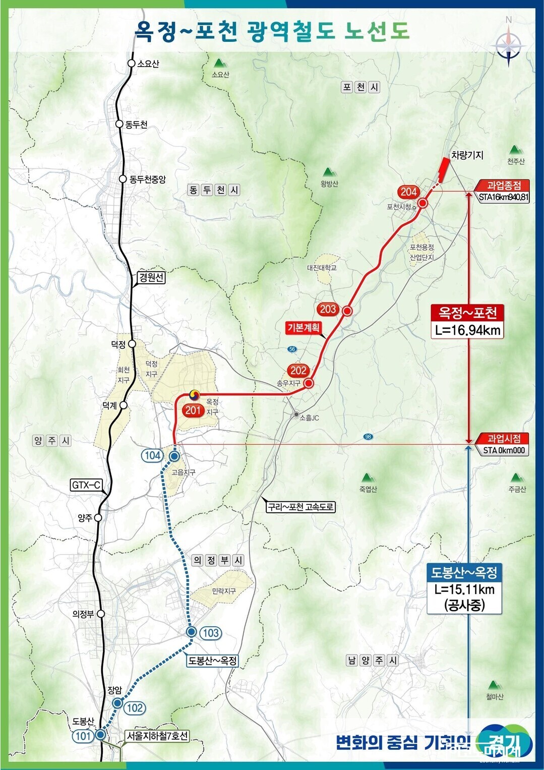‘옥정포천 광역철도’는 양주시 고읍지구에서 옥정지구를 거쳐 포천시 군내면까지 총연장 16.9km를 연결하는 지하철 건설 사업이다. 서울지하철 7호선의 기존 연장선인 ‘도봉산옥정 광역철도’의 종점을 넘어 포천까지 이어지는 노선으로, 국가 균형발전 프로젝트의 일환으로 추진된다.