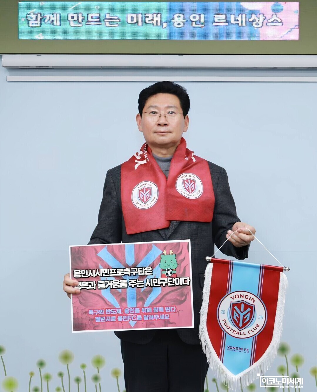 [이코노미세계] 2026년 K리그2 무대에 첫 발을 내딛는 용인특례시 시민 프로축구단 ‘용인FC’를 향한 지역사회의 기대감이 점차 고조되고 있다. 구단주인 이상일 용인특례시장은 시민 참여형 응원 캠페인에 직접 나서며 창단 초기 분위기 조성에 힘을 보탰다.