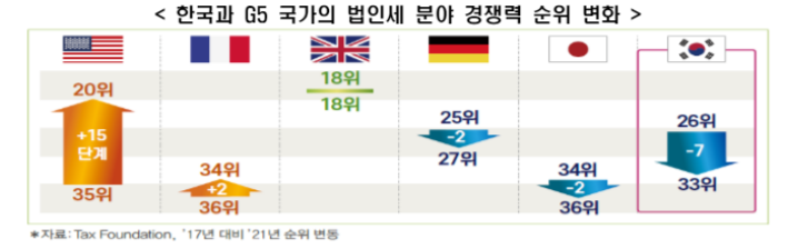 한국경제연구원이 미국 조세재단의 글로벌조세경쟁력보고서를 활용해 한국과 주요 선진국(G5)의 조세경쟁력 추이를 비교·분석한 결과, 한국의 조세경쟁력 순위는 2017년 17위에서 2021년 26위로 5년간 9단계 하락하여 주요 선진국(G5) 대비 가장 큰 하락 폭을 보였다. 조세경쟁력 보고서의 비교 대상 국가인 OECD 37개국 중에서도 한국의 조세경쟁력 순위가 가장 크게 떨어진 것으로 나타났다.