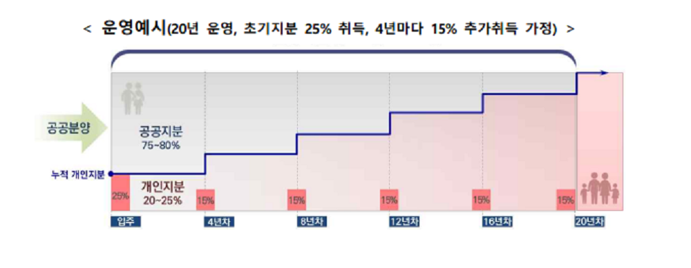 내용은 수분양자가 분양가의 10~25%만 내고 입주한 뒤 공공주택사업자로부터 20~30년에 걸쳐 남은 지분을 취득하는 공공분양주택이다.