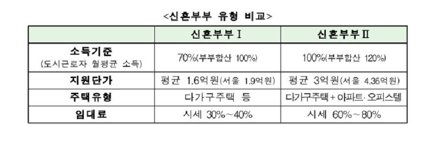 신혼부부 매입임대주택은 ①다가구 주택 등에서 시세 30~40%로 거주할 수 있는 Ⅰ유형(1,691호)와 ②아파트·오피스텔 등에서 시세 60~80%로 거주할 수 있는 Ⅱ유형(1,663호)이 공급된다.