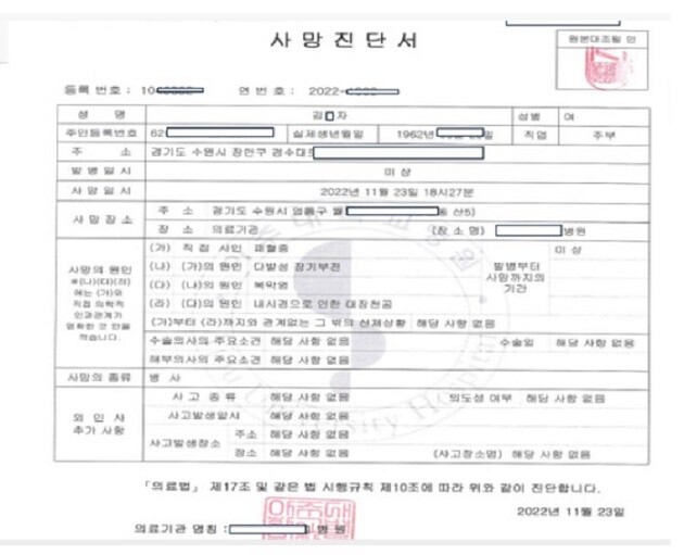 피해자는 피의자가 발생시킨 대장 천공으로 인해 같은 날 11:27경 수원시 소재 대학병원 응급실에 내원하여 급성복막염 진단을 받고 입원치료를 받게 되었으나 피해자의 상태는 점차 악화되었고 내시경으로 인한 대장 천공을 원인으로 한 복막염 다발성 장기부전 및 패혈증을 앓던 피해자는 끝내 2022.11.23. 17:27경 심정지에 의한 사망에 이르게 되었다.