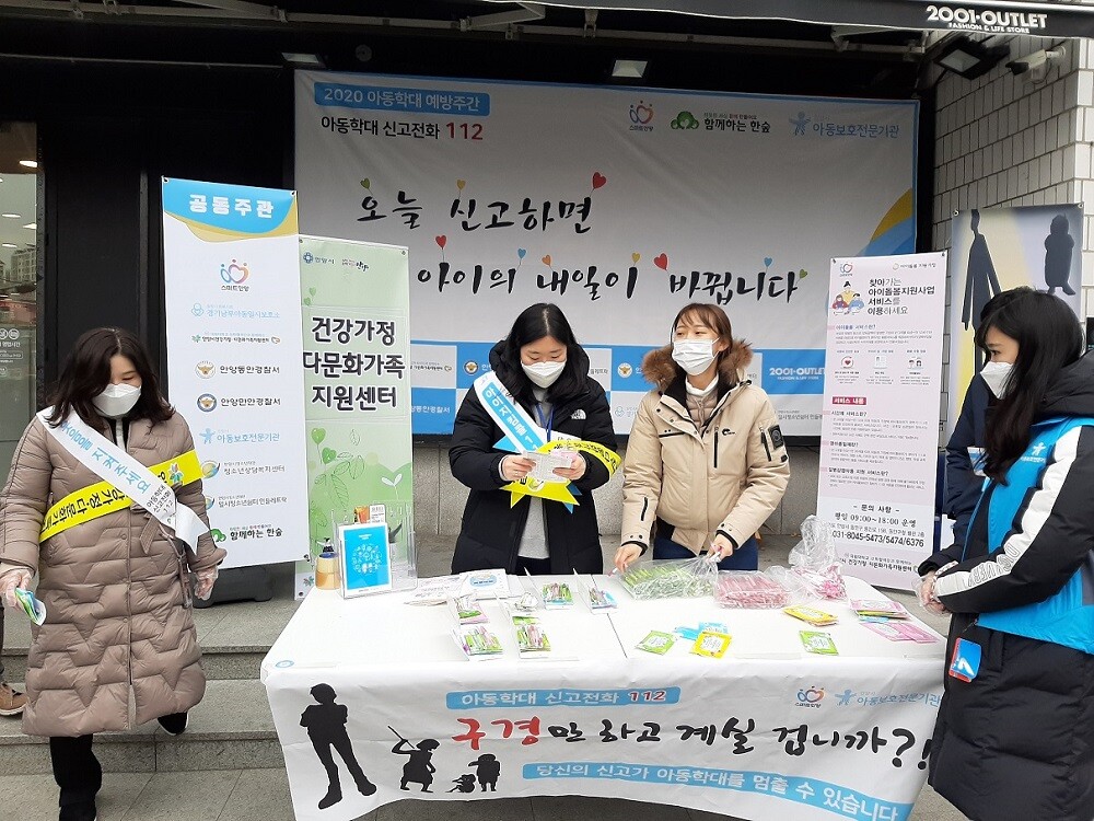 [이코노미세계] 김병민 기자= 안양시는 아동학대 예방의 날을 맞아 지역사회 아동권리의 중요성을 알리기 위한 연합 캠페인이 20일 안양4동 2001아울렛 앞 일대에서 전개됐다고 23일 밝혔다. 이날 40여명의 캠페인단원은 아동학대 예방과 신고절차 등에 대한 안내문을 전시해 행인들의 시선을 불러 모았다. 또 아동학대를 예방 안내문구가 적힌 물티슈와 볼펜 등도 배부하여 적극적인 관심과 참여를 당부했다. 앞서 아동학대 예방의 날인 19일에는 관내 식당가를 방문해 이와 같은 유인물을 배포한 바 있다. 최대호 안양시장은“지역사회에 아동권리의 중요성을 알리고 학대에 대한 적극적인 신고가 이뤄져야 한다.”며, 미래를 짊어질 어린이에게 행복의 미소를 안겨주자고 밝혔다. 한편 아동학대 예방의 날은 WWSF(여성세계정상기금/여성과 아동을 위한 비영리 기구)가 아동을 상습적 학대와 폭행으로부터 보호하자는 취지에서 지난 2000년 11월 19일로 제정했다. 11월 19일부터 25일까지는 아동학대 예방주간으로 운영되고 있다. 이번 캠페인은 안양시 공무원을 비롯해 안양시아동보호전문기관, 안양만안(동안)경찰서, 함께하는 한숲, 경기남부일시보호소, 일시청소년쉼터민들레뜨락, 안양시건강가정·다문화가족지원센터, 안양시청소년상담복지센터 등 9개 기관이 공동 주관했다.