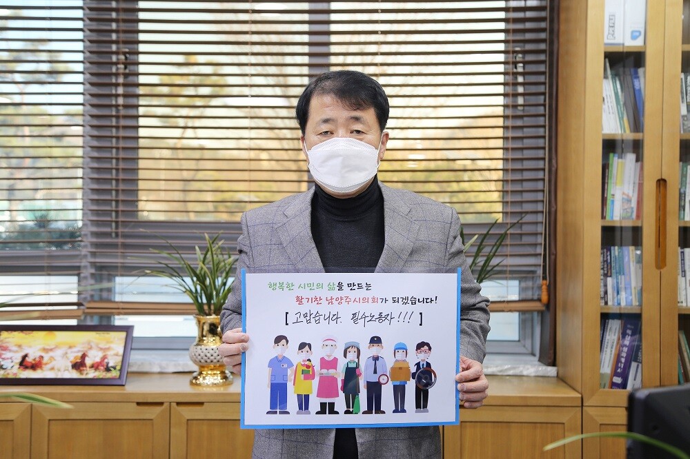 [이코노미세계]] 김병민 기자= 남양주시의회 이철영 의장은 21일 ‘필수노동자 응원 캠페인’에 동참하여 코로나 사태 속에서도 공동체 유지를 위해 굳건히 자리를 지키고 있는 필수노동자들에게 감사의 마음을 전했다. 이번 캠페인은 코로나19 위기 상황의 장기화에도 대면서비스를 중단 없이 펼치고 있는 보건의료 및 사회복지 종사자, 돌봄 종사자, 환경미화원, 배달업 종사자 등의 노동자들을 격려하고 응원하기 위해 시작되었으며 릴레이 방식으로 진행되고 있다. 이철영 의장은 위험을 감수하며 근무하고 있는 필수노동자들의 건강을 염려하며“어려운 여건 속에서도 우리사회가 멈추지 않고 제 기능을 다 할 수 있도록 버팀목이 되어주시는 필수노동자 여러분들의 노고에 깊은 감사를 드린다”고 하였다. 한편 구리시의회 김형수 의장으로부터 지명을 받아 이번 캠페인에 참여하게 된 이철영 의장은 다음 캠페인 참여자로 포천시의회 손세화 의장, 남양주시이통장연합회 조양래 회장을 지명했다.