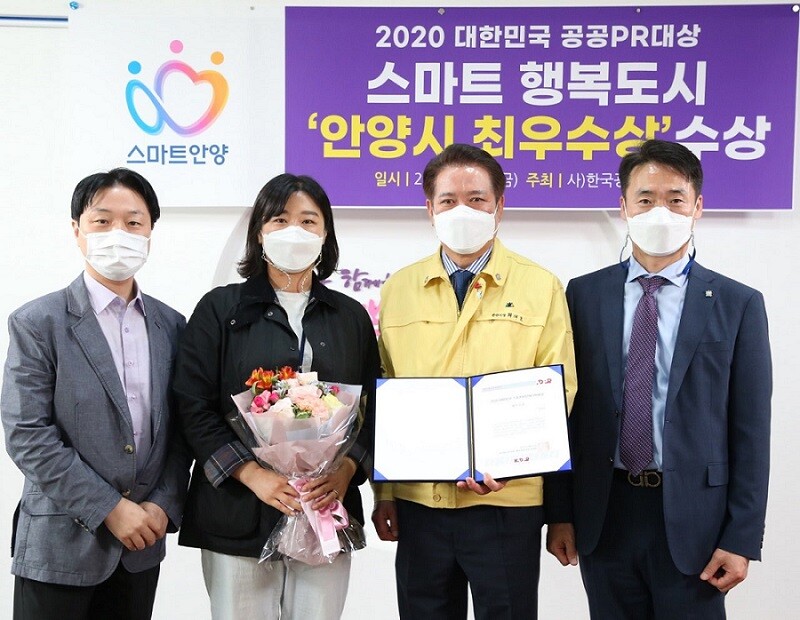 [이코노미세계] 안양시가 코로나19 극복 메시지를 담은’마음방역 1번가‘로 2021 대한민국 공공PR대상’시상식에서 SNS분야 최우수상을 차지했다고 26일 밝혔다. 이에 따른 자체시상식이 이날 청사 접견실에서 최대호 시장과 담당공무원이 참석한 가운데 있었다.