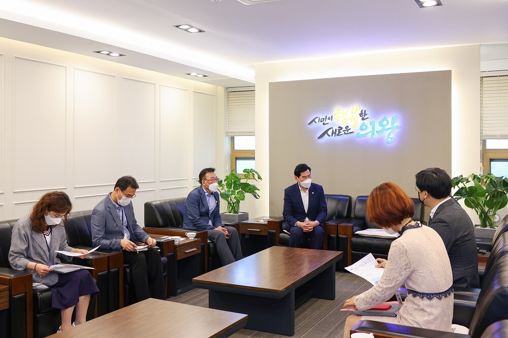 [이코노미세계] 김상돈 의왕시장은 4일 의왕고천공공택지개발지구 자족시설용지(2-3,4)에 입주기업으로 선정된 ㈜트루본(대표 임광현) 관계자들과 간담회를 갖고 의왕시 첨단 IT산업 발전 등에 대한 의견을 나눴다.