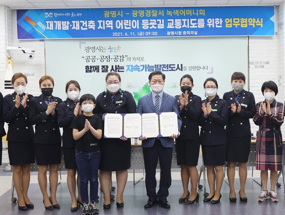 [이코노미세계] 광명시는 11일 시청 중회의실에서 광명경찰서 녹색어머니회와 ‘재개발・재건축 지역 어린이 등굣길 교통지도를 위한 업무협약’을 맺었다.