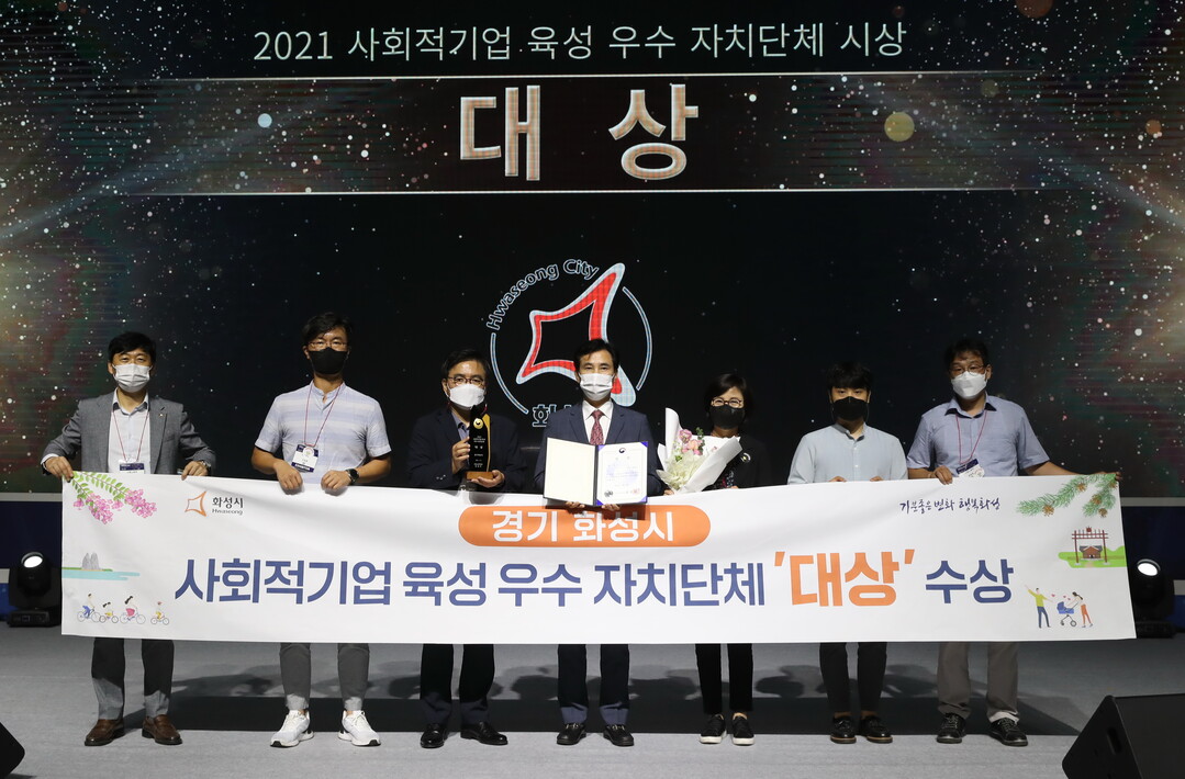 [이코노미세계] 화성시가 2일 광주광역시 김대중컨벤션센터에서 열린 고용노동부 주관 ‘2021년도 사회적기업의 날’기념식에서 사회적기업 육성 우수 자치단체 대상을 수상했다.