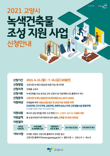 지원을 희망하는 대상 건축물 소유자는 오는 16일까지 고양시 홈페이지의 새소식 메뉴에서 신청 서류를 확인·작성한 후, 녹색도시담당관 녹색건축팀으로 방문하거나 등기우편으로 접수하면 된다.