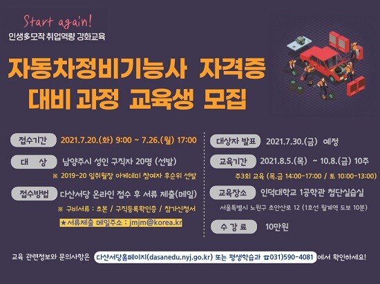 교육은 10월로 예정된 ‘2021년 제4회 자동차정비기능사 시험’을 대비해 8월 5일부터 10월 8일까지 10주간 진행될 예정이며, 자세한 교육 일정 및 내용은 다산서당 홈페이지에서 확인할 수 있다.