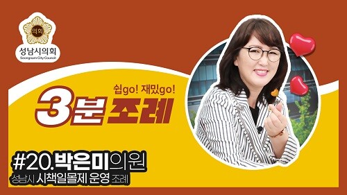‘성남시의회 3분 조례’는 유튜브, 페이스북 등 SNS 채널을 통하여 성남시의회 의원들이 발의하여 시행되는 조례를 시민들이 알기 쉽도록 설명하는 콘텐츠이다.