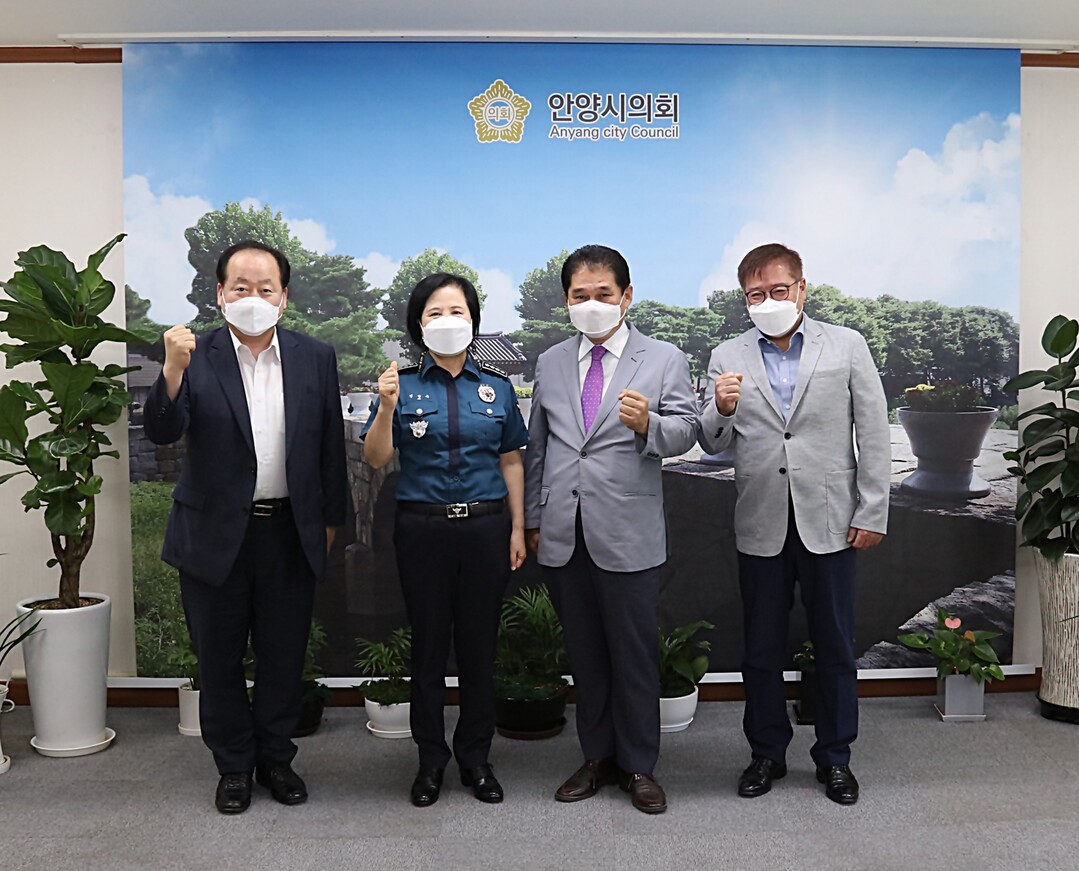[이코노미세계] 안양시의회 최우규 의장은 21일 안양시의회 의장실에서 진점옥 만안경찰서장 등 경찰 관계자와 기관 간 상호협력 및 안양시민의 안전과 행복을 위한 방안을 협의하는 간담회를 가졌다.