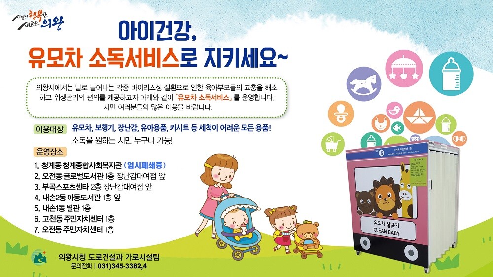 현재 의왕시 청계종합사회복지관, 부곡스포츠센터, 글로벌도서관, 오전동·고천동 주민센터, 내손1동 별관, 내손2동 아동도서관 등 7개소에 유모차 살균소독기가 설치되어 있으나, 현재 청계종합사회복지관은 코로나19 선별진료소로 사용됨에 따라 임시폐쇄 조치되었다.
