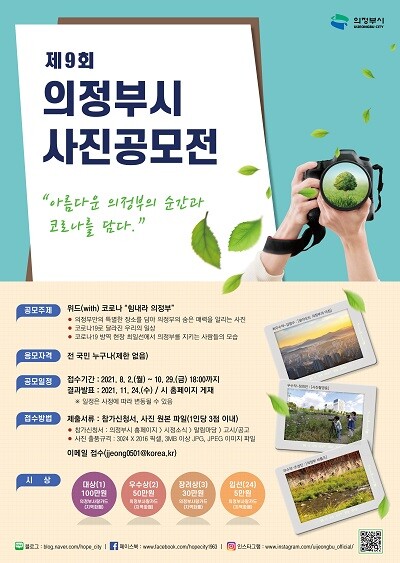 이종태 홍보과장은 “이번 공모전을 통해 코로나19로 지친 시민들이 일상의 소중함을 느끼고 소소한 행복을 돌아볼 수 있기를 바란다.”며 “아울러 많은 시민들이 의정부시의 아름답고 특별한 장소에서 힐링의 시간을 가졌으면 좋겠다.”고 밝혔다.