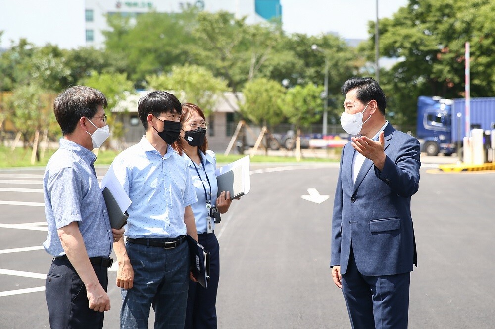 [이코노미세계] 김상돈 의왕시장은 5일 의왕시 이동에 위치한‘의왕 화물자동차 공영차고지 조성사업’준공현장을 방문해 공사 진행상황을 최종 점검하고 공사 관계자를 격려했다.