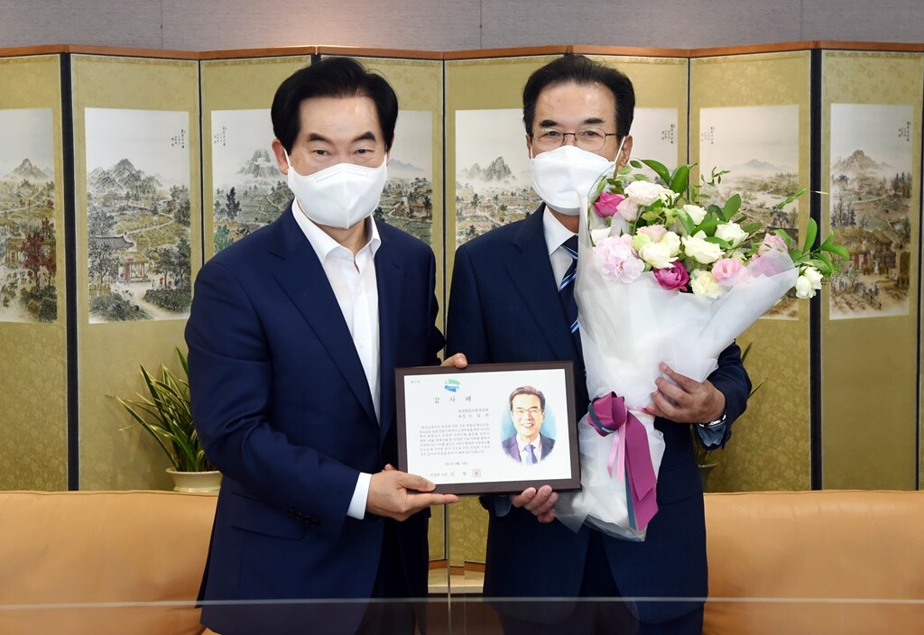 [이코노미세계] 의정부시는 8월 10일 농협중앙회 회장실을 방문해 농업발전과 시 지원활동에 힘쓴 농협중앙회 이성희 회장에게 감사패를 전달했다.