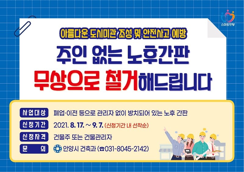 안양시는 올해 말까지 무연고 노후간판의 철거를 지원하기로 하고, 이달 17일부터 오는 9월 7일까지 정비신청을 받는다고 11일 밝혔다.