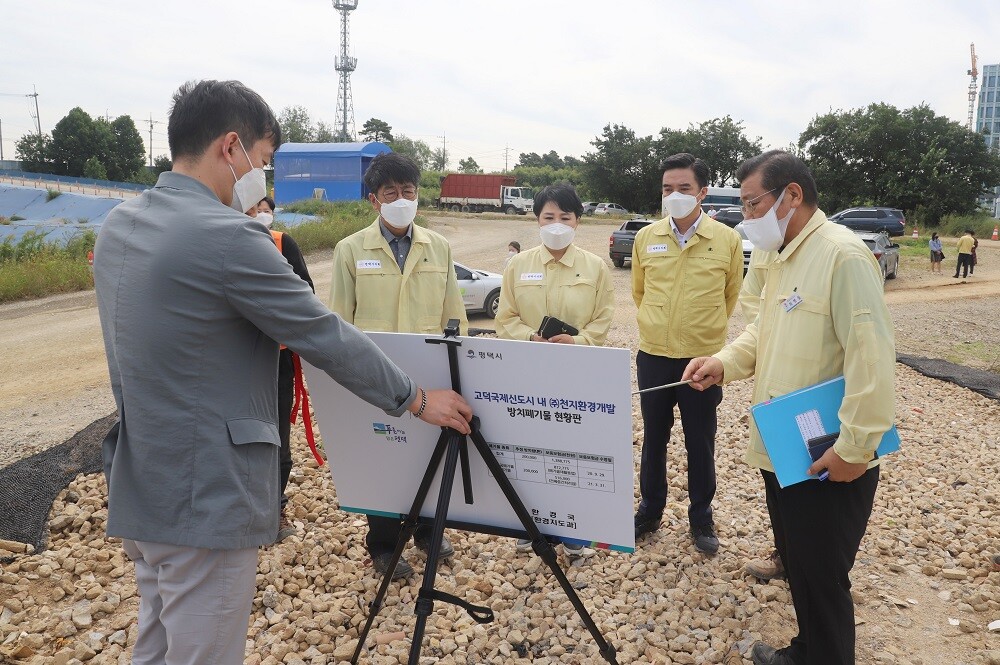 [이코노미세계] 평택시의회 복지환경위원회 곽미연 위원장과 유승영‧정일구 의원은 14일 중간가공폐기물, 순환골재, 무기성오니 등 약 20만 톤의 폐기물이 방치된 고덕국제신도시 내 고덕면 해창리 일대를 방문해 현장 실태 및 향후 처리계획 등을 점검했다.