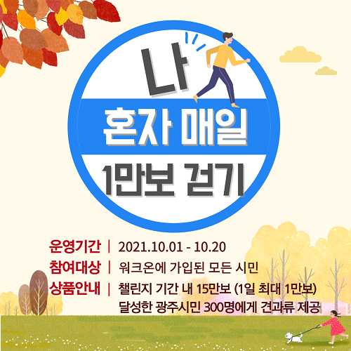 또한, 코로나19로 인한 사회적 거리두리가 연장됨에 따라 여럿이 걷기보다 혼자 걷기를 권하는 ‘나 혼자 1만보 걷기(10월 선착순 챌린지)’를 실시한다. 5일부터 23일까지 19일 동안 진행되며 총 15만보를 먼저 달성한 300명에게 콜레스테롤 예방에 좋은 견과류 1박스 제공한다.