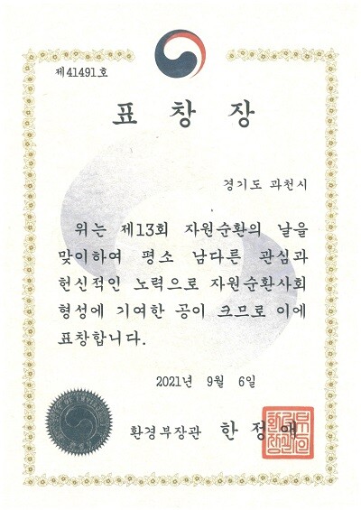 [이코노미세계] 과천시는 ‘제13회 자원순환의 날’과 관련해 환경부 장관 표창을 수상했다고 밝혔다.