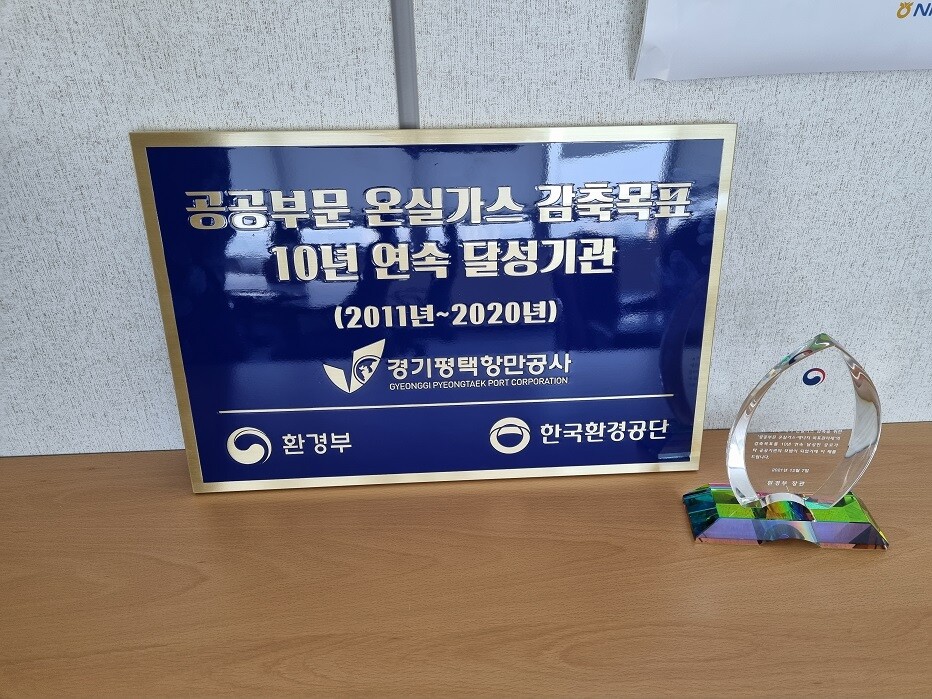 지난 7일, 경기평택항만공사는 코엑스에서 열린 2021 공공부문 목표관리제 성과보고회에서 2011년부터 2020년까지 매년 온실가스 감축 목표량을 달성함으로써 그 공로를 인정하는 공로패와 현판을 받았다.