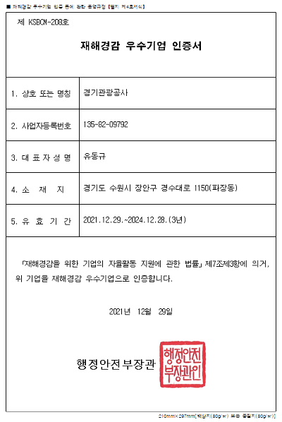 [이코노미세계] 경기관광공사(이하 공사)가 행정안전부 주관 재해경감 우수기업 인증(제 KSBCM-208호)을 획득했다고 밝혔다.