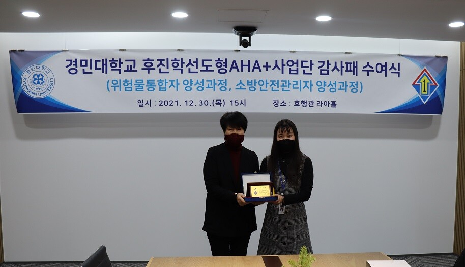 이번 감사패 수여는 경민대가 2020년 혁신지원사업 후진학선도형(3유형) 사업을 통해 경기북부지역 1기갑여단 군부대 장병을 대상으로 “위험물통합자 양성과정”과 “소방안전 관리자(1,2급) 양성과정을 운영하여 2개 과정 총204명(2020년 60명, 2021년 144명)이 수료 하였고, 174건의 국가 자격증을 취득하도록 지원하였다.