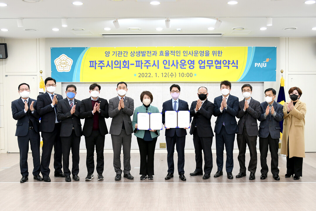 [이코노미세계] 파주시의회(의장 한양수)는 1월 12일 지방의회 인사권 독립의 안정적 정착과 효율적인 인사 협력체계 구축을 위해 파주시와 업무협약을 체결했다.