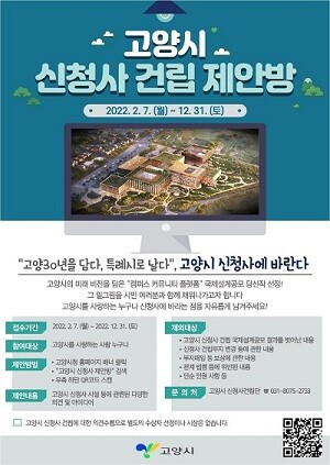 [이코노미세계] 고양시(시장 이재준)가 2월 7일부터 신청사 건립과 관련된 시민 의견수렴 창구인 온라인 사이트 ‘고양시 신청사 건립 제안방’을 오픈한다.