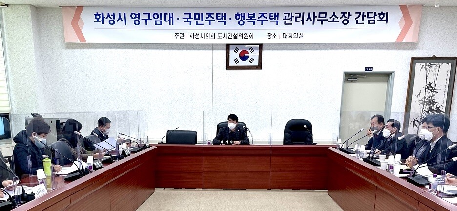 [이코노미세계] 화성시의회 도시건설위원회 배정수 위원장과 소속위원 정흥범, 공영애, 박경아 의원은 7일 화성시의회 대회의실에서 공공임대주택 공동전기료 지원 관련 간담회를 가졌다.