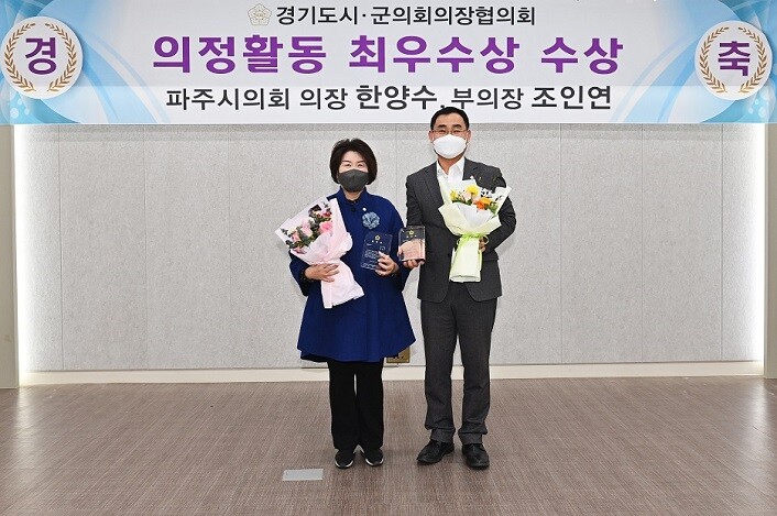 [이코노미세계] 파주시의회는 한양수 의장, 조인연 부의장이 7일 파주시의회 1층 세미나실에서 열린 표창 수여식에서 경기도 시·군의회의장협의회 의정활동 최우수의원 상을 수상했다고 밝혔다.