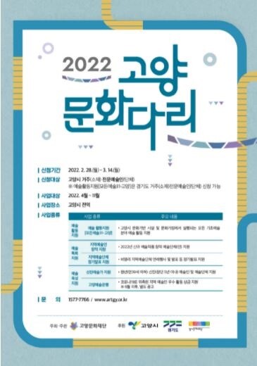[이코노미세계] 고양문화재단은 고양특례시 예술인 및 예술단체의 문화예술진흥 및 육성을 위해 새롭게 개편된 2022년 [고양문화다리] 사업의 공모를 시작한다. 올해는 ‘예술활동지원’, ‘예술특화지원’, ‘예술육성지원’의 세 가지 카테고리 아래 총 5개의 다양한 개별 공모지원사업이 동시에 진행이 되며, 신청 및 접수는 2월 28일부터 3월 14일까지다.