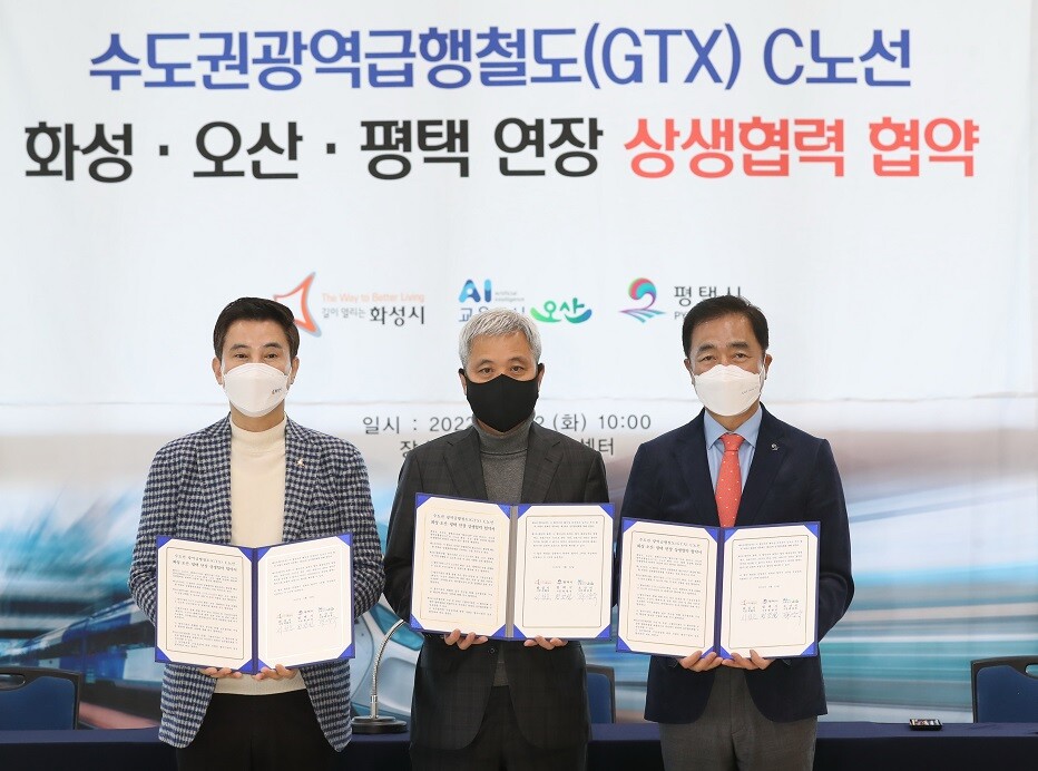 [이코노미세계] 화성시가 22일 오산·평택시와 ‘수도권광역급행철도(GTX) C노선 화성·오산·평택 연장 상생협력 협약’을 체결했다.