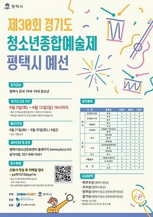[이코노미세계] 평택시 위탁기관인 평택시청소년문화센터는 청소년의 예술적 성장을 도모하고 재능과 끼를 표출할 수 있는 제30회 경기도청소년종합예술제(평택시 예선) 참가자를 모집한다.