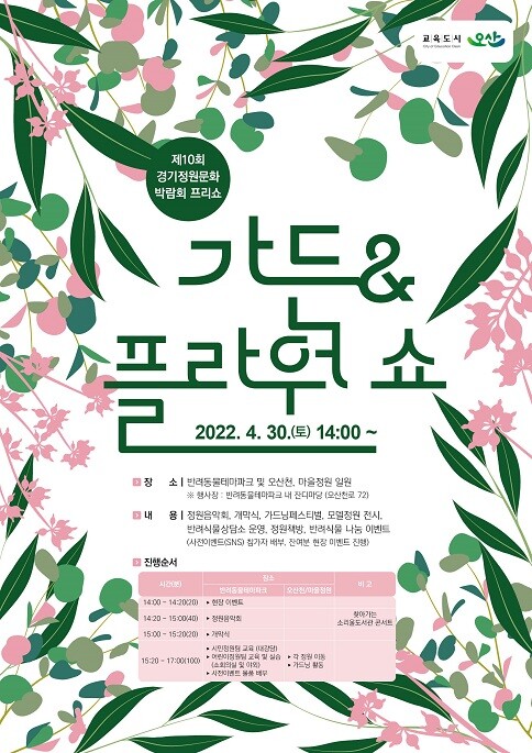 [이코노미세계] 오산시(시장 곽상욱)는 오늘 4월30일 토요일 오후 2시부터 반려동물테마파크에서 제10회 경기정원문화박람회 프리쇼 행사인 “오산 가든 앤 플라워 쇼”를 개최한다고 밝혔다.