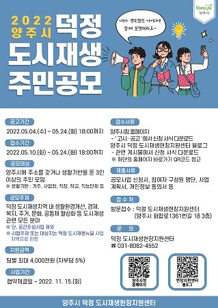[이코노미세계] 양주시 덕정 도시재생현장지원센터는 오는 24일까지 ‘2022년 덕정 도시재생 주민공모사업’(이하 도시재생 주민공모사업)에 참여할 시민을 모집한다.