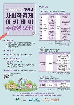 [이코노미세계] 고양산업진흥원(원장 오창희) 고양시사회적경제지원센터(이하 지원센터)는 사회적경제에 관심이 있거나 고양시 소재의 창업 희망자, 사회적경제기업 종사자를 대상으로 ‘2022년 상반기 고양시 사회적경제 아카데미 기초과정 수강생’을 모집 중이다.