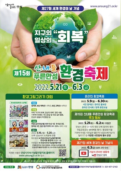 ‘하나뿐인 지구’를 주제로 열릴 ‘제15회 산내들 푸른 안성 환경축제’는 ‘지구의 회복, 일상의 회복’이란 부제로 온라인 환경축제, 환경주간행사, 환경의 날 기념식 3가지로 진행된다.