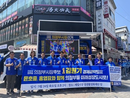 김원기 더불어민주당 의정부시장후보는 24일 제일시장 상권활성화재단 앞에서 윤호중 더불어민주당 비상대책위원장, 홍영표 전 원내대표, 김민철 국회의원, 오영환 국회의원과 시·도의원 후보자들과 함께 경제공약 발표회를 가졌다. 이날 공약발표회는 의정부제1선거구에 출마한 김경선 경기도의원 후보의 사회로 시작됐다.
