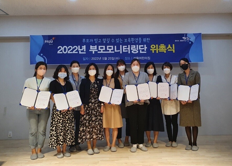 [이코노미세계] 파주시는 보육서비스 품질 향상을 위해 25일 문산 선율어린이집에서 ‘2022년 어린이집 부모모니터링단’ 위촉식을 열고, 모티터링단 9명에게 위촉장을 수여했다.
