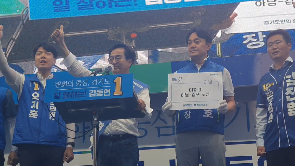 연설을 마친 김동연·김상호 후보는 하남의 ‘파란31 대장정’ 미래 희망로 ‘GTX-D 하남 연장’을 발표했다.