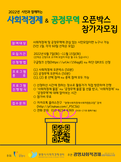 「사회적경제&공정무역 오픈박스」에 대한 자세한 사항은 카카오톡 플러스 친구 “광명사회적경제사회적협동조합” 검색 또는 전화로 문의하면 된다.