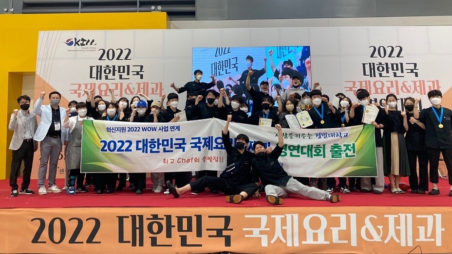 [이코노미세계] 국내 최대 규모로 6월4일~ 6일 까지 aT센터에서 개최된 ‘2022 대한민국 국제요리&제과경연대회’에서 경민대학교(총장 이연신) 호텔조리과와 카페베이커리과는 Live 요리부문과 제과전시부분에 110여명이 출전하여 코스 LIVE부분 환경부장관상(대상), 제과전시부분 농수산식품공사장상(최우수상), 바리스타부분 국회의원상(우수상)을 포함하여 금상, 은상, 동상 등 “출전자 전원 수상”이라는 쾌거를 이루었다.