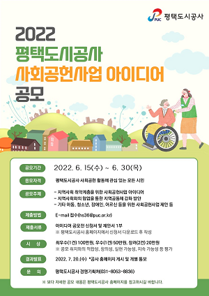 [이코노미세계] 평택도시공사(사장 김재수)가 오는 6월 30일 까지 시민과 함께하는 ‘2022 사회공헌사업 아이디어 공모’를 실시한다고 전했다.