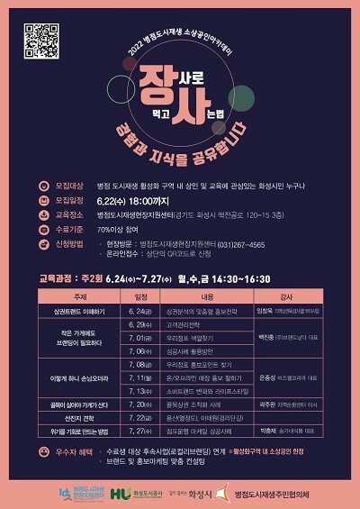 모집대상은 병점 도시재생활성화구역 내 소상공인 또는 교육에 관심있는 화성 시민 15인이며, 교육신청을 원하는 경우 QR코드 스캔 후 신청하면 된다.
