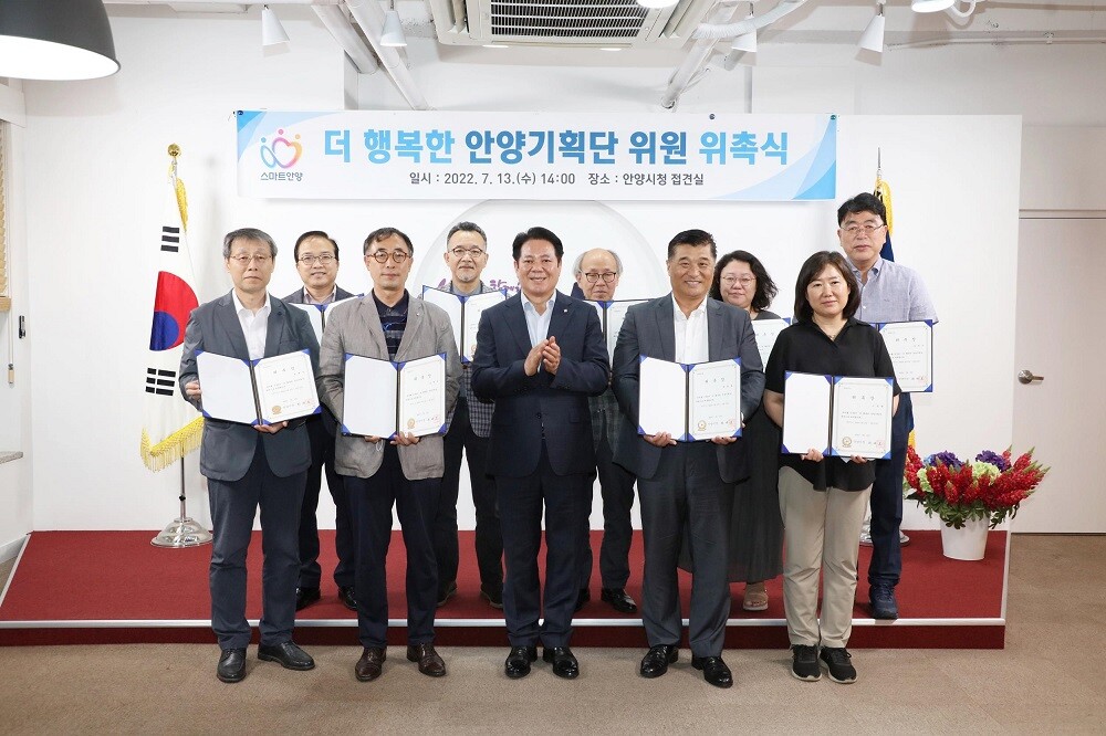 14일 시에 따르면‘더 행복한 안양기획단’(이하 안양기획단)이 13일 최대호 안양시장으로부터 위촉장을 받고 출범했다고 밝힌 것.