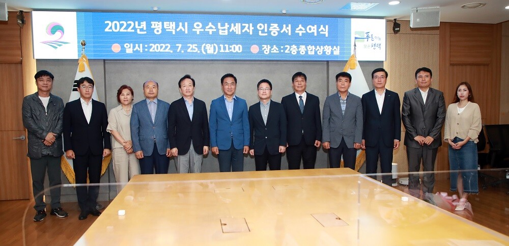 [이코노미세계] 평택시(시장 정장선)는 지방세를 성실하게 납부하여 시 재정확충에 기여한 납세자들이 사회적으로 존경과 우대를 받을 수 있는 토대를 마련하고자, 에스피엘 주식회사 등 법인 6곳과 개인 8명을 ‘2022년 평택시 우수납세자’로 선정하여 인증서를 수여했다.