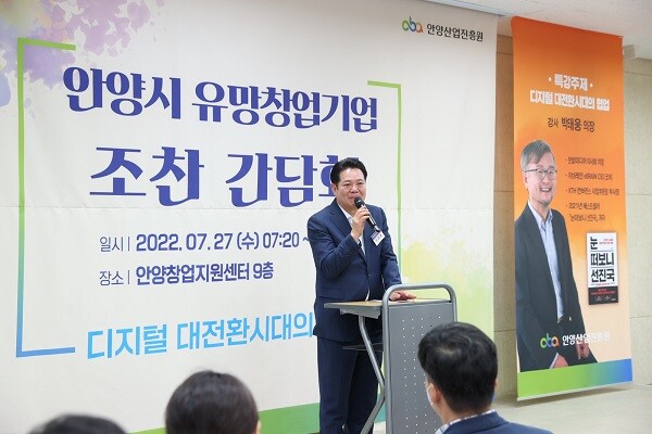 [이코노미세계] 최대호 안양시장이 22일 유망창업기업인 조찬 간담회에 참석해 대전환 시대 기업들의 노력을 당부했다고 안양시가 밝혔다.
