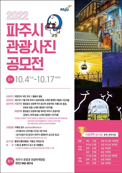 [이코노미세계] 파주시(시장 김경일)는 다양한 파주 관광지의 새로운 매력을 발굴하기 위해 ‘2022 파주시 관광사진 공모전’ 신청작품을 10월 4일부터 17일까지 접수받는다.