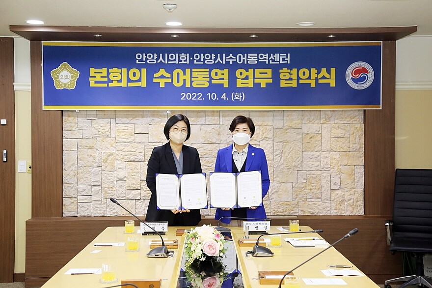 [이코노미세계] 안양시의회(의장 최병일)는 4일 안양시수어통역센터(센터장 현영옥)와 ‘안양시의회 본회의 수어통역 업무 협약’을 체결했다고 밝혔다.